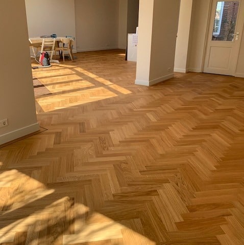 Deze visgraat tapis vloer select bestaat uit plankjes van 6 mm dik, 90 mm breed en 450 mm lang (ook verkrijgbaar in andere maten). De plankjes dienen op een vooraf gelegde houten tussenvloer verijmd en vastgenageld te worden in een visgraatmotief. Hierna moet de vloer geschuurd, gevoegd en gepolijst worden, waarna er tot slot een olie of lak als afwerking op wordt aangebracht.